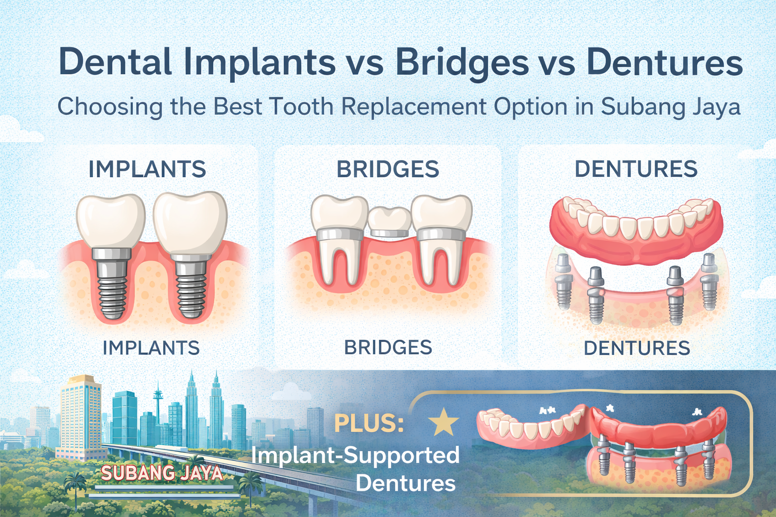 Missing teeth can affect your confidence, chewing ability, speech, and even your jawbone health. If you’re exploring replacement options in Subang Jaya, you’ve probably come across three main solutions: